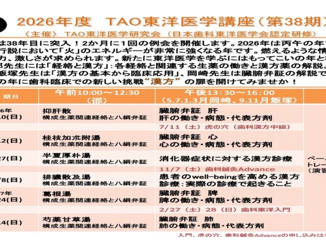 topic 未分類kajimaya 2026年度TAO東洋医学講座 (第38期)歯科東洋医学会認定研修 2026年4月11日2026年4月11日2026年度TAO東洋医学講座 (第38期)歯科東洋医学会認定研修 へのコメントはまだありません